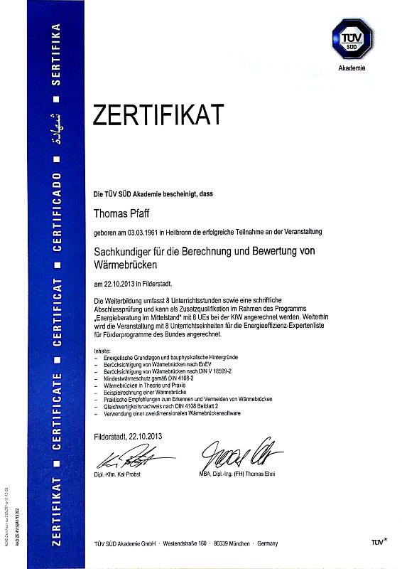 - 2013 Sachkundiger für die Berechnung von Wärmebrücken