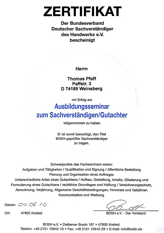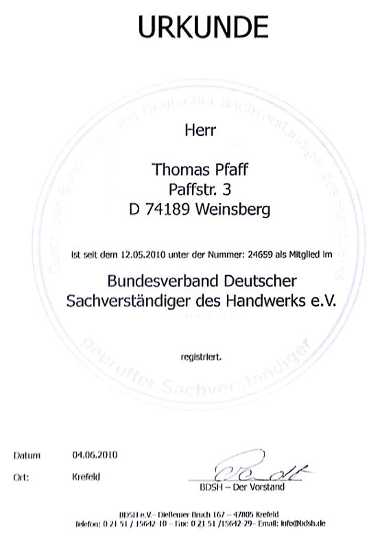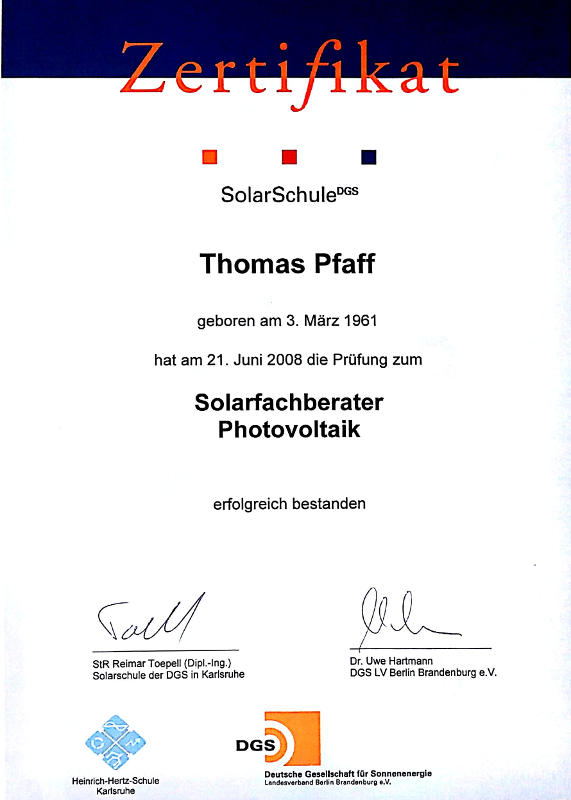 - 2010 Sachverständiger für Photovoltaik-Anlagen